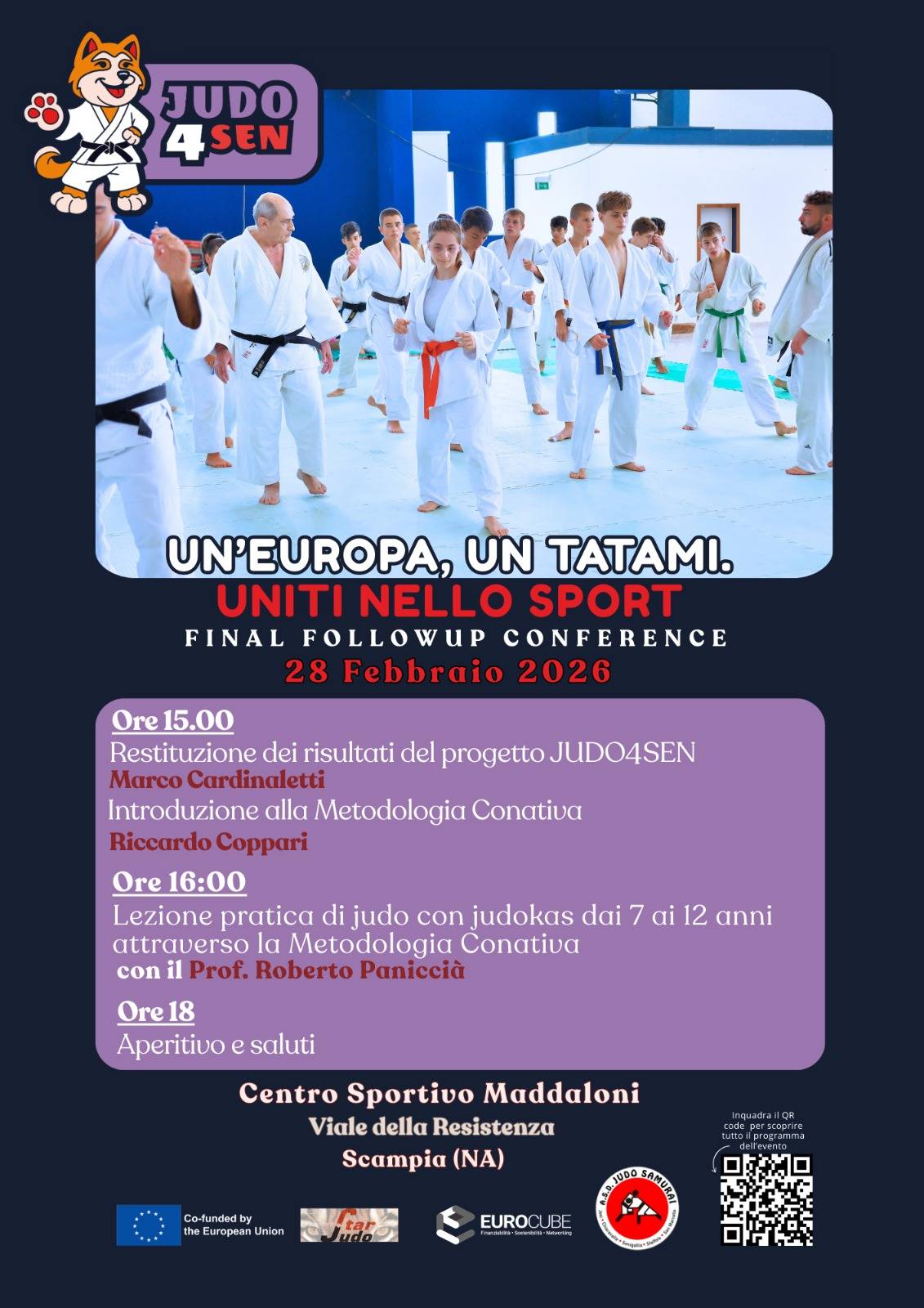 JUDO4SEN è un progetto della Judo Samurai, finanziato dal Programma Erasmus+ 2024 che ha come obiettivo quello di promuovere le pari opportunità e l’inclusione sociale nello sport, attraverso l’applicazione della metodologia conativa e l’organizzazione di un evento internazionale di Judo che vedrà coivolti ragazzi e atleti da 13 paesi europei.